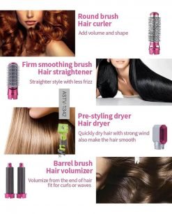 5 in 1: This hot air brush has five interchangeable attachments. These attachments include a round brush, flat brush, dryer nozzle and two suction curling barrels.